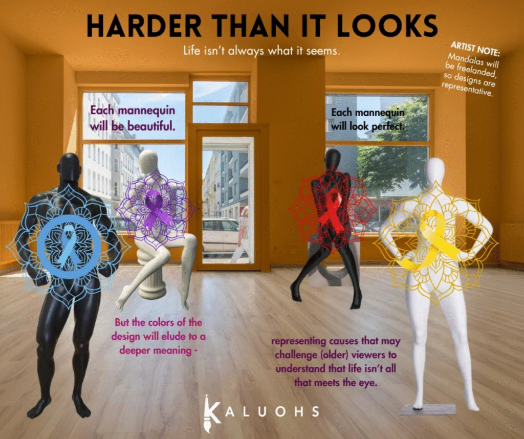 With my proposal, I wanted to paint each mannequin with one primary color so that when you first look at the display, you’re just captivated by the intricacies and beauty of the perfect-looking mannequins. But, the reason why I wanted to call it “Harder Than it Looks,” is that each color would represent a cause that may be lurking under the surface that people may have to struggle with ~ showing that life isn’t always as perfect as it seems.