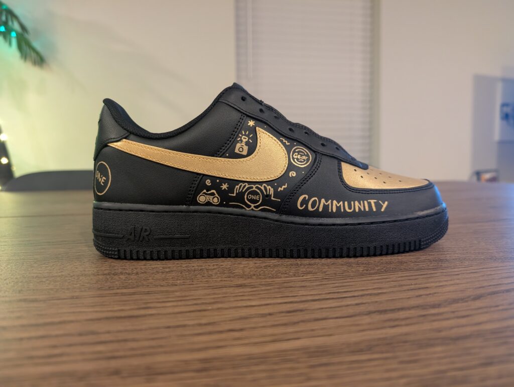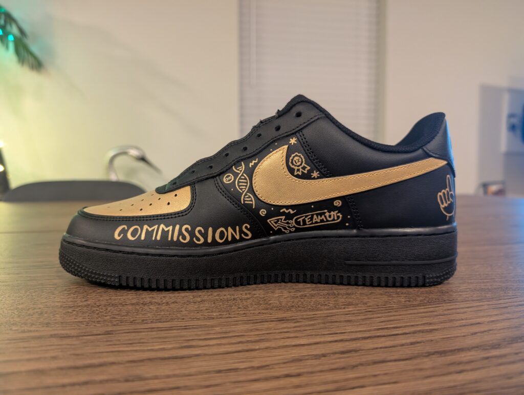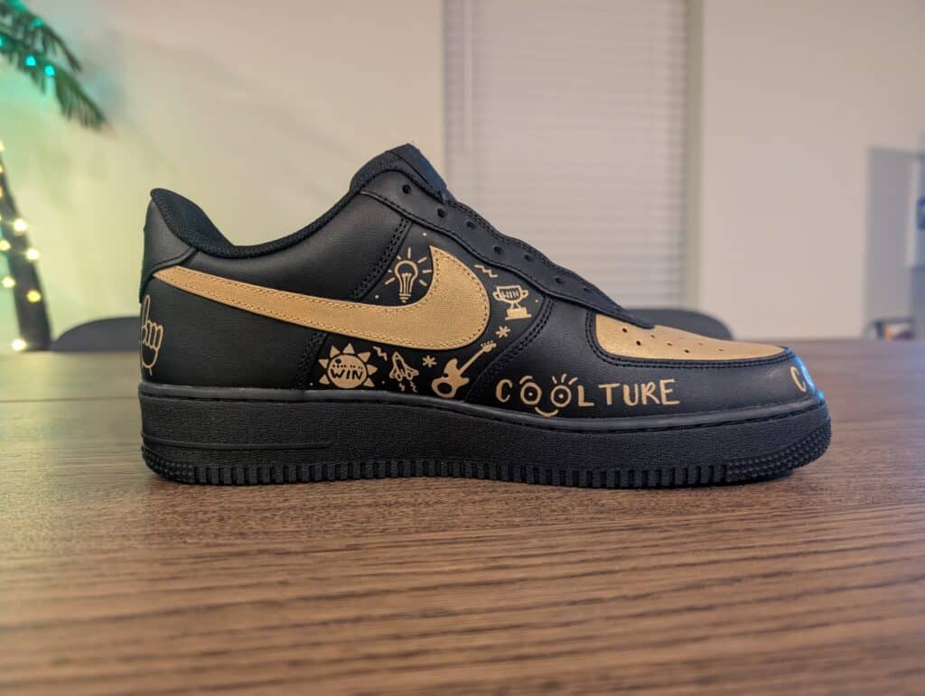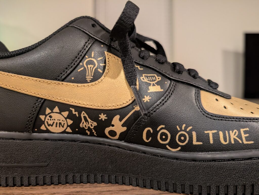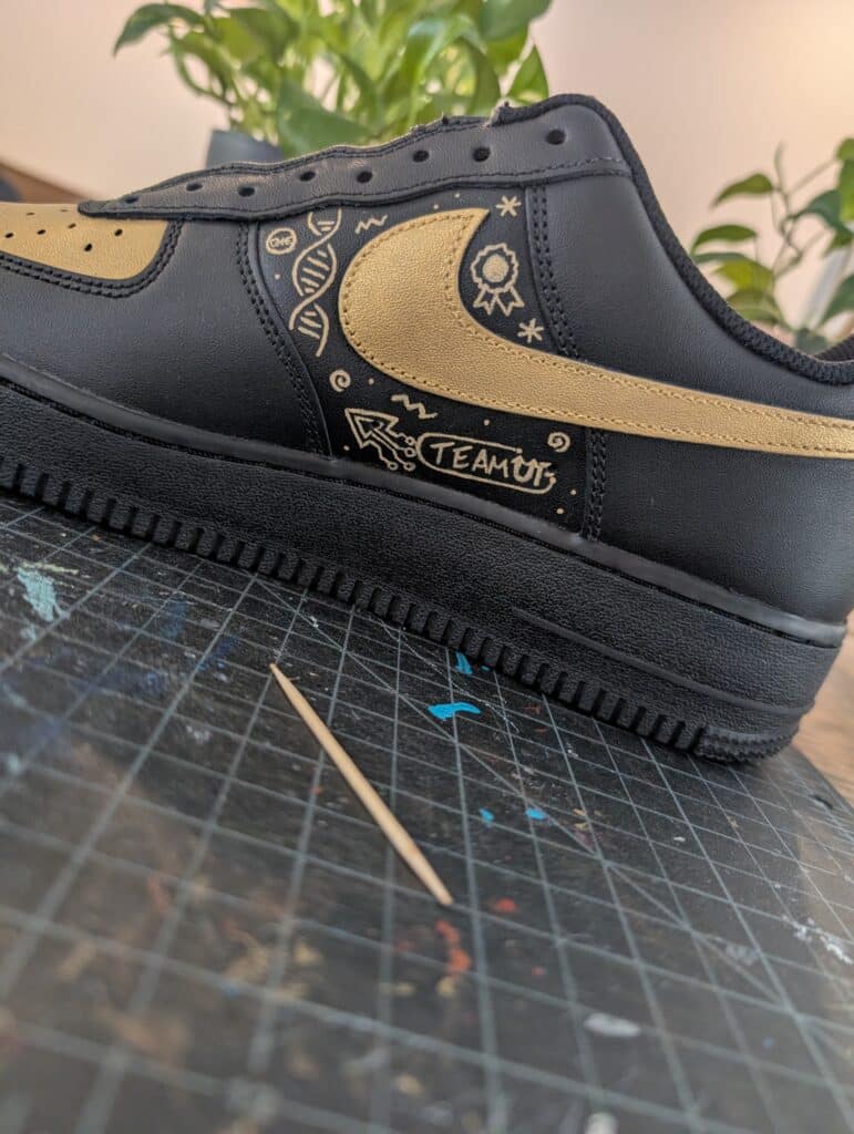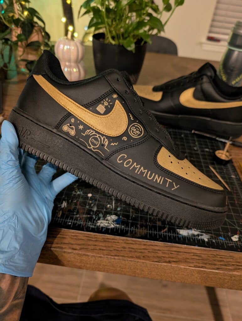 From this mockup, the shoes were hand-painted with Angelus Direct leather paint using a TOOTHPICK for the details. Have you ever painted something so intricate? This was definitely one of my favorite designs to bring to life inspired by their Realty ONE Group branded “doodle wall!”